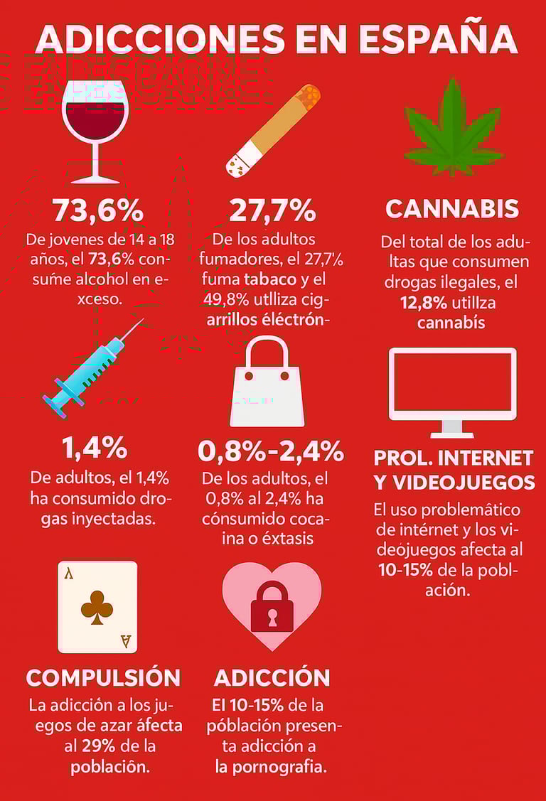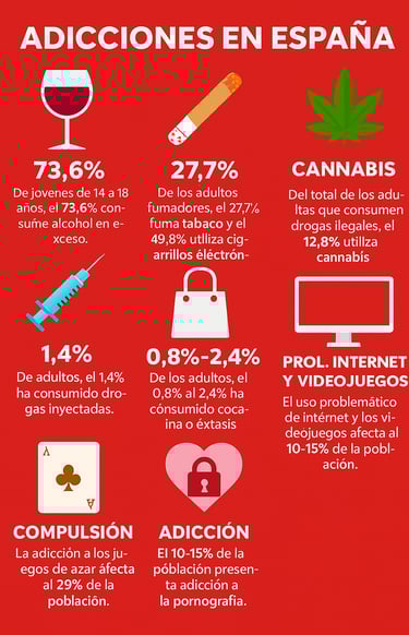 En España, un porcentaje significativo de la población presenta algún tipo de adicción a sustancias o comportamientos. El alcohol es el más consumido, con 73,6 % de jóvenes de 14 a 18 años que lo han probado y un consumo excesivo en el 26,2 % de hombres y 17,4 % de mujeres jóvenes. El tabaco afecta al 27,7 % de adolescentes, y los cigarrillos electrónicos al 49,8 %. El cannabis se consume en el último año por el 21,8 % de estudiantes, mientras que drogas como cocaína, éxtasis o metanfetaminas afectan entre el 0,8 % y el 2,4 % de adultos. La ludopatía afecta al 1,4 % de adultos, y las compras compulsivas impactan especialmente a mujeres de 45 años, con consecuencias económicas y familiares. El uso problemático de internet y videojuegos afecta sobre todo a jóvenes, con conflictos académicos y familiares. La adicción al sexo se da principalmente en hombres, iniciándose alrededor de los 25 años, y el uso de pornografía en el último año alcanza al 29 % de adultos. El consumo excesivo de azúcar y alimentación compulsiva afecta al 10‑15 % de la población, ligado a ansiedad y problemas de salud. En conjunto, entre el 20 % y el 30 % de los españoles podría presentar algún tipo de adicción, mostrando la diversidad y la necesidad de prevención y tratamiento integral.